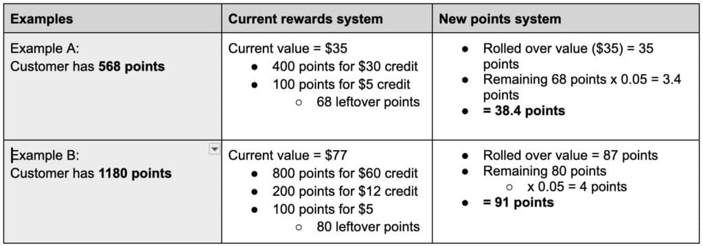 All existing points were converted into the new system on April 13th 2026. Not to worry, your existing rewards value will be preserved. Your points will appear lower even though their value has been preserved, only because under the new system they now represent your redeemable value (1 point = $1 redeemable store credit). See example chart below!